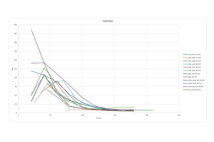 Teknologisk Institut har i undersøgelsen anvendt målinger af COD og turbiditet til at vurdere længden af returskylningen, der måler henholdsvis mængden af organiske stoffer og vandets klarhed. Derudover har instituttet taget boreprøver af filtrene i brug for at fastslå, hvornår filtrene er tilstrækkeligt skyllet.